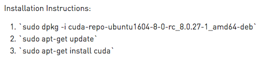 去官网喵了一眼,发现Cuda8.0居然发布了,支持Ubuntu16。发布页面最后跟着一行小字“For further information, see the Installation Guide for Linux”。卧槽,我一直为官网的安装说明就下面这三行字: