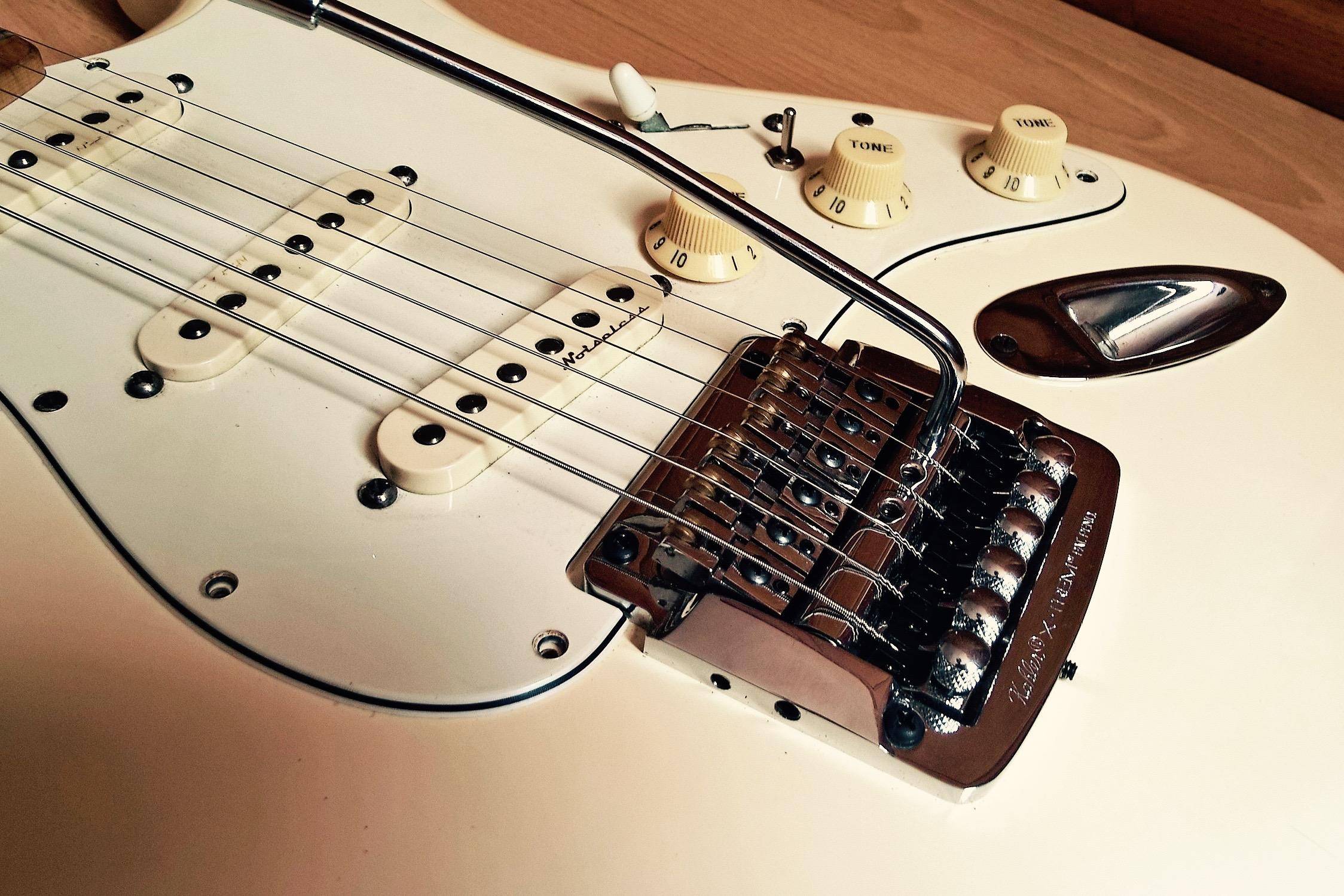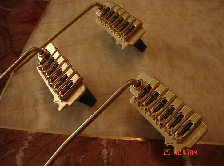 Kahler X-trem 4300 少数派琴桥,还挺稳定的,做工一般。比起Floyd Rose,它可以调节每跟琴弦的高度,来适应9.5弧度的琴颈。