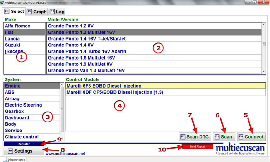 [第 3 步:] 单击“连接”按钮(或按键盘上的 F10)。 Multiecuscan 将开始连接到您的汽车。