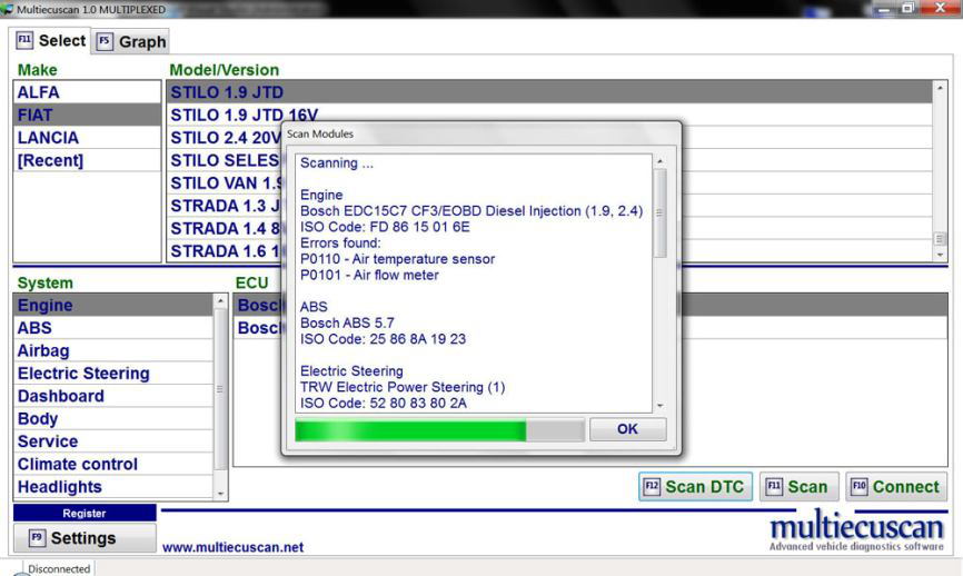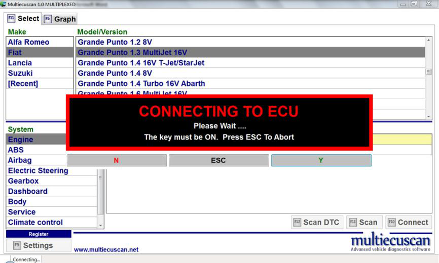 然后单击“连接”按钮(或按键盘上的 F10)。 Multiecuscan 将开始连接到您的汽车。