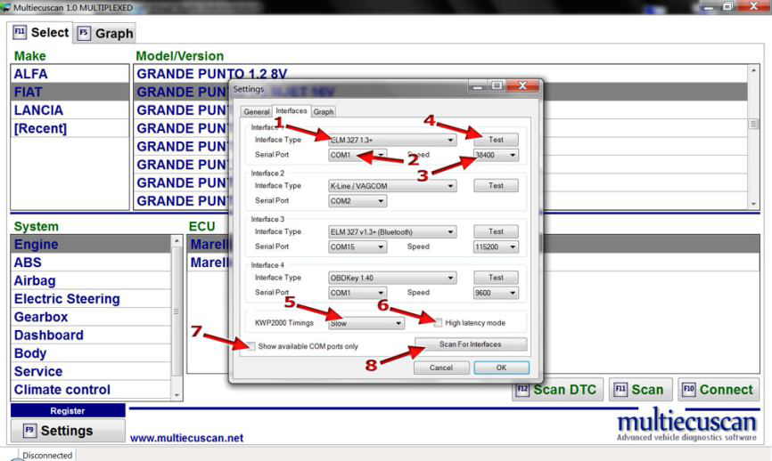 Multiecuscan 支持蓝牙 ELM、OBDKey 和 OBDLink 接口。 但是,由于这些接口的一些限制,不建议将它们用于特殊功能(如 PROXI 对准、远程控制编程、IMA 编码等)!