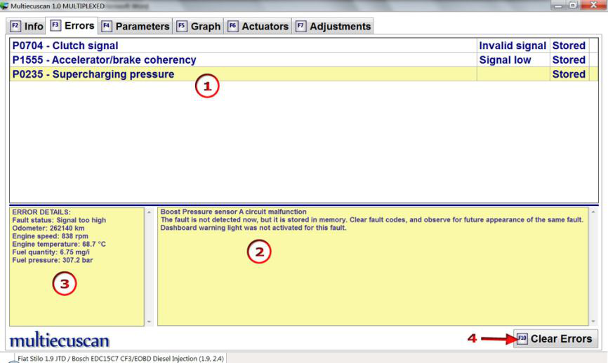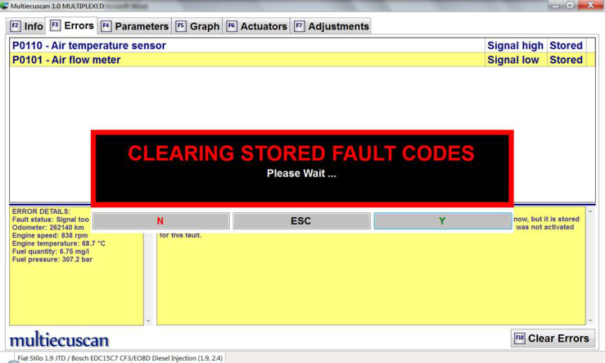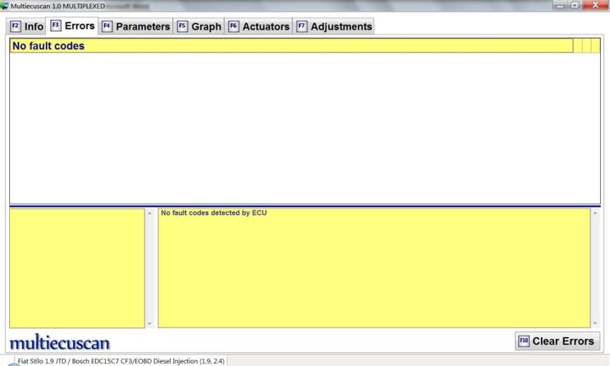 只需单击“清除错误”按钮(或按键盘上的 F10),Multiecuscan 就会清除这些错误。