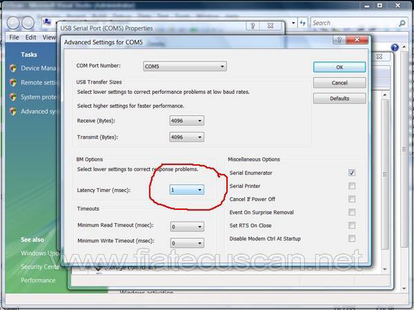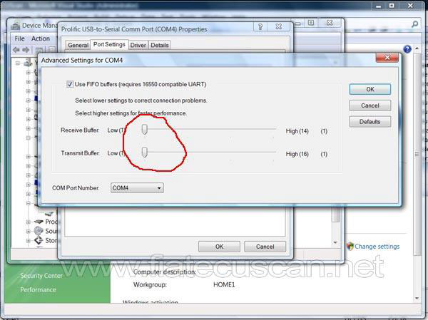 如果您有内置串行端口或 PL2303 USB 串行端口,您需要将缓冲区降低到最小值,如下一个屏幕截图所示。 请注意,对于 PL2303 USB 串行端口,您需要修改一些注册表设置以使其支持 10400 bps。
