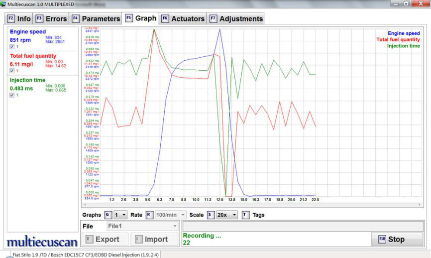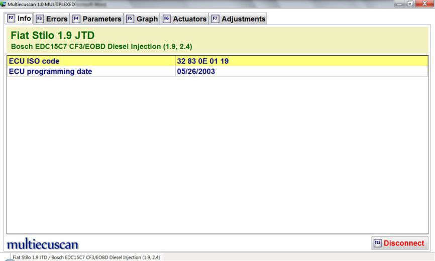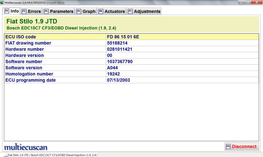 在这个例子中,我们将连接到 Fiat Stilo 1.9 JTD 的引擎控制模块,然后检查错误并检查一些实时数据。