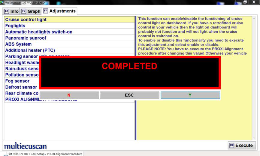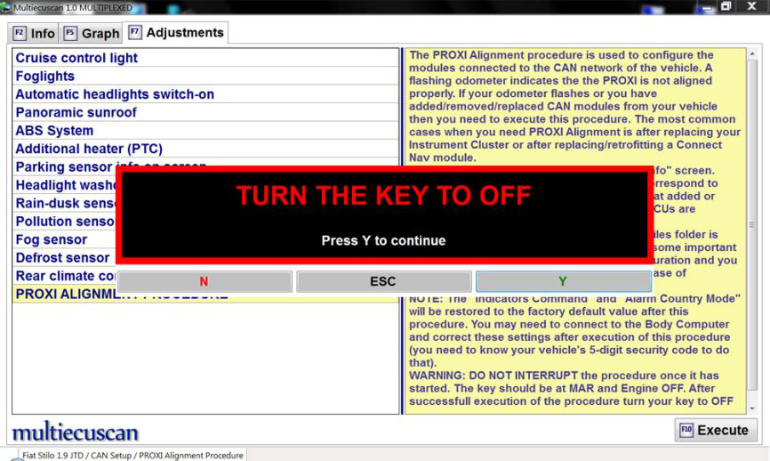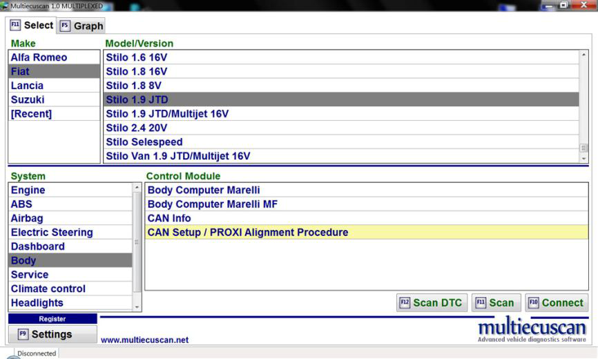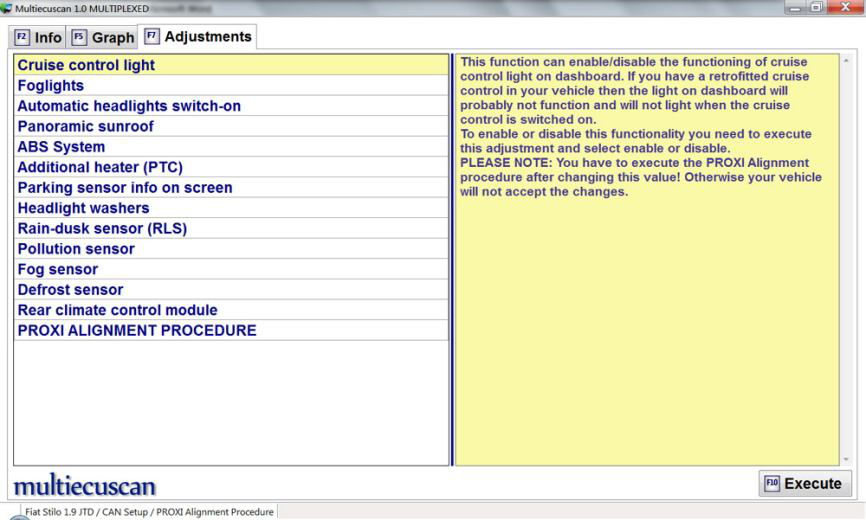 在这个例子中,我们将连接到 Fiat Stilo 并使用 PROXI Alignment 程序设置来启用仪表板上的巡航控制灯。
